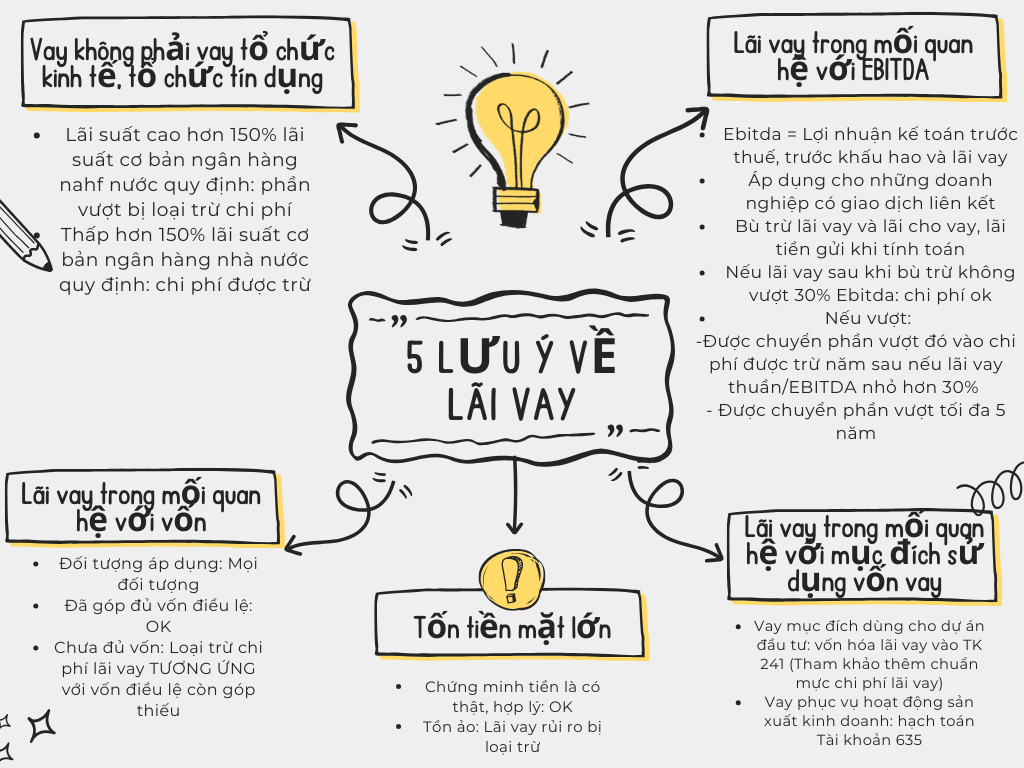 1. Nếu vay không phải là vay của tổ chức kinh tế, tổ chức tín dụng (ví dụ vay cá nhân) thì phần chi phí lãi vay đó sẽ bị khống chế 150% lãi suất cơ bản của ngân hàng nhà nước quy định. Tức là phần vượt 150% lãi suất cơ bản sẽ không được tính vào chi phí hợp lý hợp lệ
